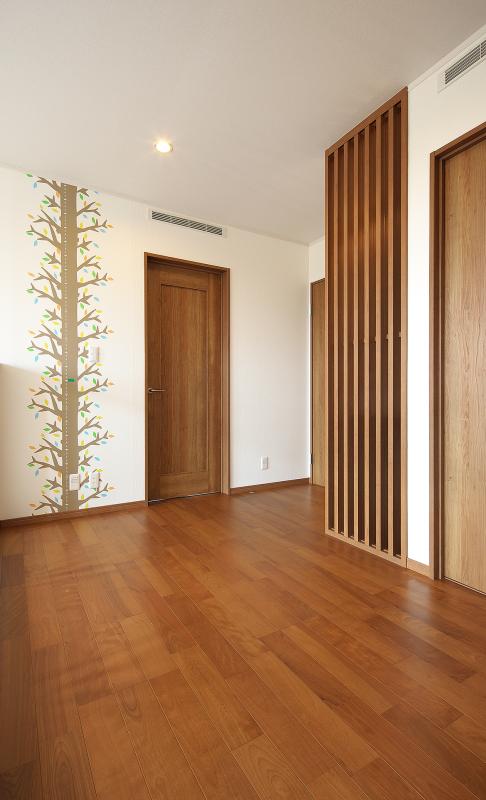 吹き抜けに面した2階のホールには、お子様の成長を刻む可愛らしい壁紙。